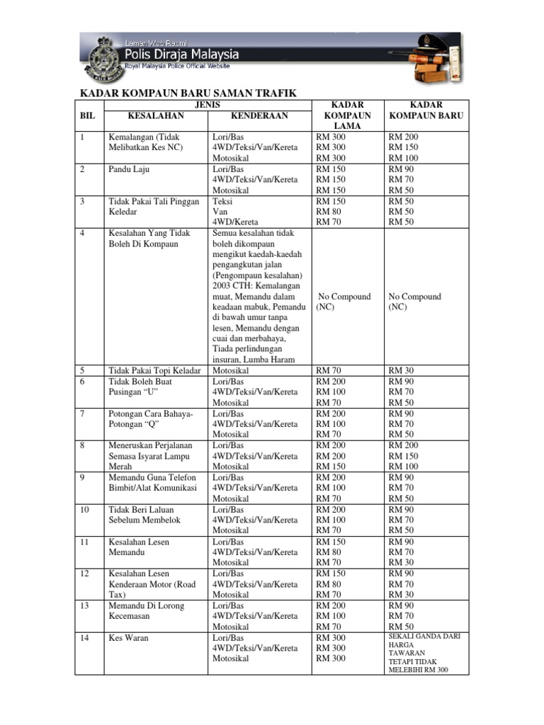 Hari bekerja 08 30 hingga 16 00 hrs 2. Kini semuanya lebih selamat pantas dan mudah untuk menyemak saman pdrm polis diraja malaysia jpj jabatan pengangkutan jalan dan automated enforcement system aes. Bayar saman polis trafik melalui kaunter. Kadar kompaun baru saman trafik jenis bil kesalahan kenderaan kadar kompaun.