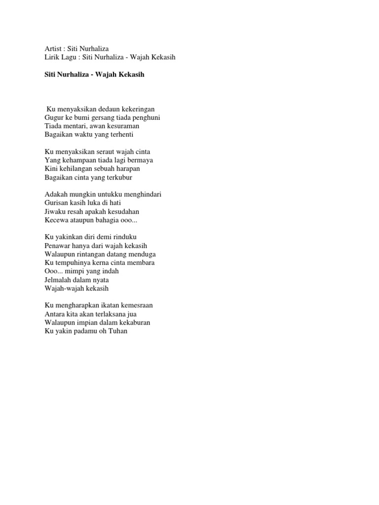 Lyric Lagu Siti Nurhaliza Wajah Kekasih Youtube